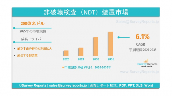 Survey Reports LLCは、2025年5月に「非破壊検査(NDT)機器市場セグメンテーション」に関する調査報告書を発行しました。この報告書は、技術別(超音波検査、視覚検査、磁粉検査、液体浸透検査、渦電流検査)、提供内容別(機器・サービス)、機器別(機器レンタル、NDT製品)、サービス別(検査サービス、 トレーニングと認証、校正サービス、データ分析と報告)、方法別(視覚検査、表面検査、体積検査)、垂直市場別(製造、石油・ガス、航空宇宙、公共インフラ)- グローバル市場分析、動向、機会、予測、2025-2035年」を発表しました。この報告書は、非破壊検査(NDT)機器市場の予測評価を提供しています。本レポートでは、非破壊検査(NDT)機器市場における主要な市場動向、成長要因、市場機会、課題、および脅威を強調しています。