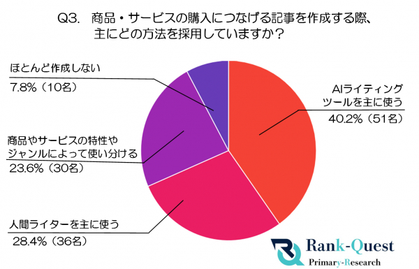 今回の調査では、商品やサービスの購入に直結する記事作成において、「AIライティングツールを主に使う」という回答が40.2%で最多となり、購入訴求型コンテンツにおいてもAI活用が進んでいることが分かりました。