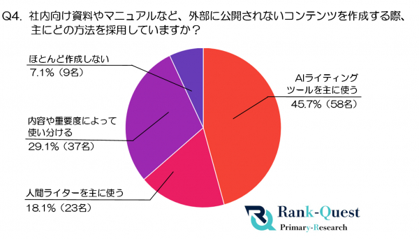 今回の調査では、社内向け資料やマニュアルなど、外部に公開されないコンテンツを作成する際に「AIライティングツールを主に使う」と回答した人が45.7%と最も多く、AIの積極的な活用傾向が顕著に現れています。
