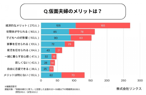 仮面夫婦と自認する638人に、関係を続けることで得られるメリットを尋ねたところ、最多回答は「経済的なメリット」(42.32%)。