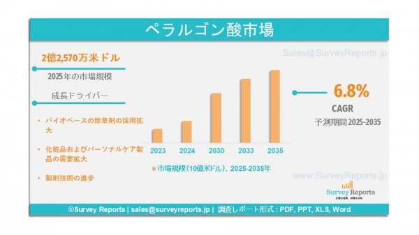 Survey Reports LLCは、2025年5月に「ペラルゴニック酸市場セグメンテーション:グレード別(合成グレードと天然グレード);用途別(洗剤、個人用ケア・化粧品、ラッカー・コーティング、潤滑剤、食品添加物、除草剤、その他);機能別(保存料、皮膚コンディショニング剤、抗菌剤、 香料); 製品タイプ別(界面活性剤、潤滑剤、溶剤、エステル、乳化剤); 製剤形態別(液体、固体、半固体); 最終ユーザー産業別(化学製造、農業化学品、食品加工、化粧品・個人用ケア製品、医薬品製造); 流通チャネル別(直接販売、卸売業者、オンライン販売、小売) - グローバル市場分析、動向、機会、および予測(2025-2035)は、ペラルゴニック酸市場の予測評価を提供します。このレポートでは、ペラルゴニック酸市場の成長要因、市場機会、課題、および脅威を含む、複数の主要な市場動向を強調しています。