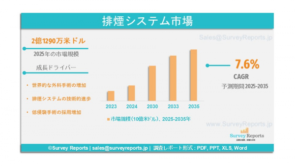 Survey Reports LLCは、2025年5月に「煙排出システム市場セグメンテーション(製品別:煙排出システム、固定式システム、携帯式システム)、煙排出フィルター(超低浸透空気(ULPA)フィルター、活性炭フィルター、インラインフィルター、プレフィルター)、 煙排出ペンシルおよびワンド、煙排出融合製品(シールド)、煙排出チューブ、アクセサリー)、用途別(腹腔鏡手術、整形外科、医療美容手術、その他)、最終用途別(病院、外来手術センター(ASCs)、美容外科センター、歯科クリニック、獣医療提供者)、 流量の種類(パルス流量、連続流量);設計(植込み型心室補助装置、経皮的心室補助装置) - グローバル市場分析、動向、機会、および予測、2025-2035は、煙排出システム市場の予測評価を提供します。このレポートは、煙排出システム市場における成長要因、市場機会、課題、および脅威を含む、複数の主要な市場動向を強調しています。