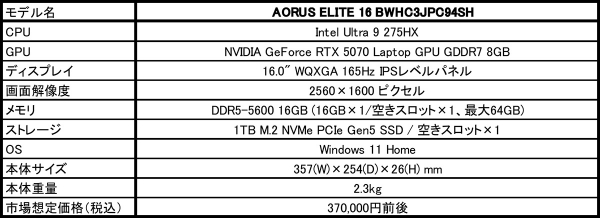 GIGABYTE、Core Ultra 9とGeForce RTX 5070搭載の16.0型ゲーミングノートPC「AORUS ELITE 16」を発売