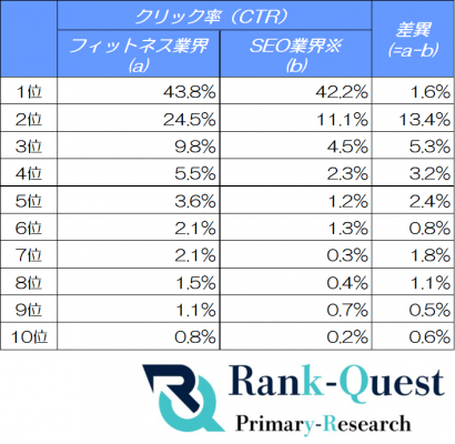 本調査では、検索結果の上位10位に入っている3,656件のフィットネス関連キーワードを対象に、順位ごとのCTR変動を徹底分析。さらに、ランクエストが運用するSEO業界向けメディア(注2)のクリック率データと比較することでフィットネス業界に特化したクリック傾向を明らかにしています。
