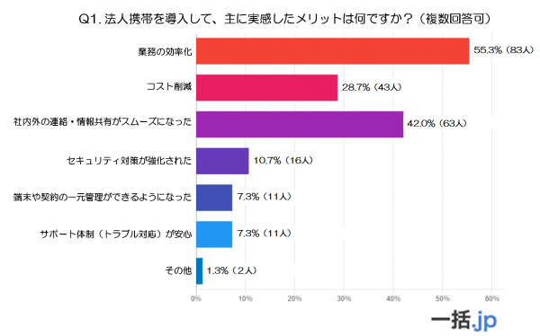 最も多かった回答は「業務の効率化」で、全体の55.3%を占めています。これは、法人携帯の導入によって多くの企業が業務プロセスの効率向上を強く実感していることを示しています。