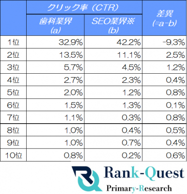 さらに、SEO業界向けの自社サイト(注2)のクリック率データと比較することで、歯科業界特有のクリック傾向やユーザー行動の違いも明らかにしています。