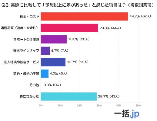 「サポートの手厚さ」(13.3%、20人)、「法人特典や独自サービス」(12.7%、19人)といったサポート面や付加価値サービスについても、一定数が予想以上の差を実感していることがうかがえます。