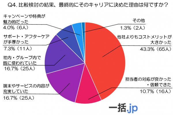 最も多かった回答は「他社よりもコストメリットが大きかった」で、全体の43.3%(65人)を占めています。この結果から、法人携帯キャリアの最終決定においてはコストパフォーマンスが圧倒的に重視されていることがわかります。
