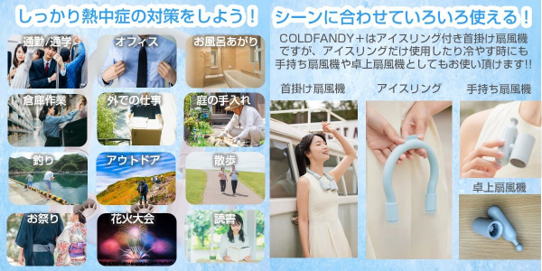 肩掛け扇風機、冷感アイスリング、手持ちファン、卓上扇風機としてもお使い頂けます。