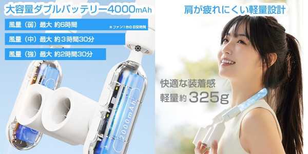 弱・中・強の3段階風量に対応。ホコリ対策カバー付き充電コネクタへ付属USBケーブルで充電。片側のファンで最長6時間の連続使用が可能。片方ずつ効率的に使用すれば、さらに長時間の利用も可能です。
