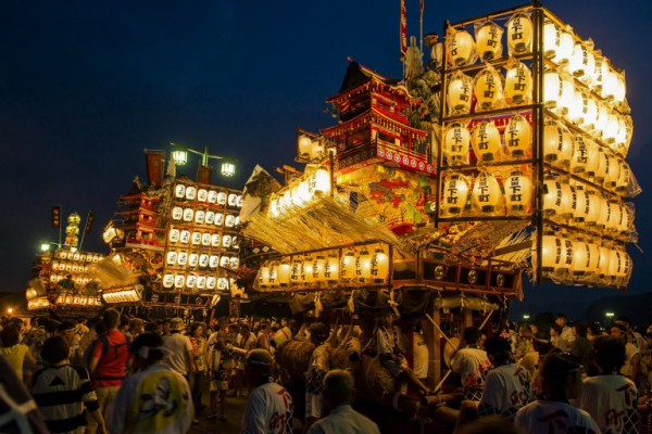 また、夜には提灯(ちょうちん)を飾り付けた優雅な晩山の巡行が行われ、祭りは一気に最高潮に達します。