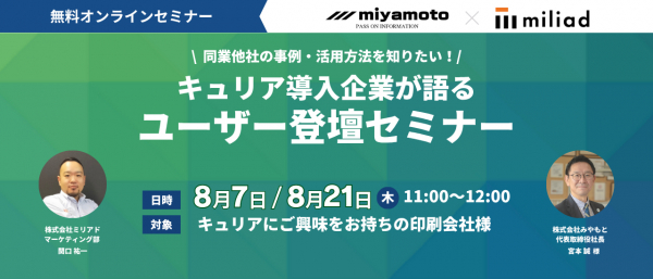 スマホコンテンツ制作ツール「キュリア」を運営する株式会社ミリアド(本社:東京都渋谷区、代表取締役CEO:樋口 清政)は、2025年8月7日(木)/8月21日(木) AM11:00から、印刷業界向けに 【ユーザー企業の生の声をお届け】キュリア導入企業 登壇セミナー と題して、株式会社みやもと(本社:栃木県宇都宮市)にご登壇いただく無料オンラインセミナーを開催することをお知らせいたします。