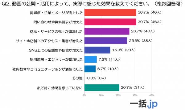 最も多かったのは「認知度・企業イメージが向上した」と「問い合わせや資料請求が増えた」という回答(いずれも30.7%)でした。これは、動画の公開や活用によって、企業のブランド認知やイメージアップに加え、実際の問い合わせ増加といった具体的な反応を感じている企業が多いことを示しています。