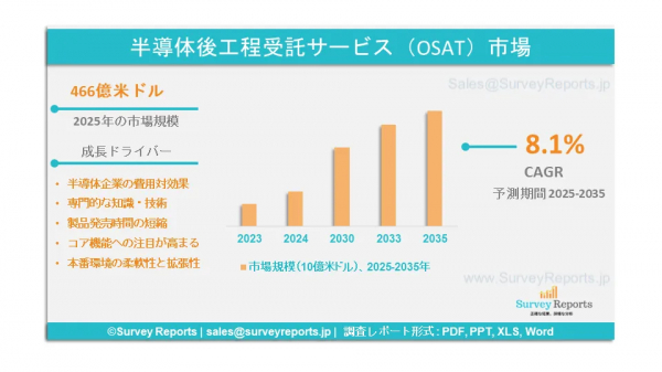 Survey Reports LLCは、2025年7月に「半導体組立・テスト受託サービス(OSAT)市場」に関する調査報告書を発表したと発表した。本報告書では、OSAT市場を以下のようにセグメントしている:サービス別(パッケージング、テスト)、パッケージングの種類別(ボール・グリッド・アレイ・パッケージング、チップスケール・パッケージング、スタックド・ダイ・パッケージング、マルチチップ・パッケージング、クアッドフラットおよびデュアルインライン・パッケージング)、用途別(通信、民生電子機器、自動車、コンピューティングおよびネットワーク、産業用途、その他)。本調査は、2025年から2035年までのOSAT市場に関する予測評価を提供しており、成長促進要因、市場機会、課題、脅威といった主要な市場動向を強調している。