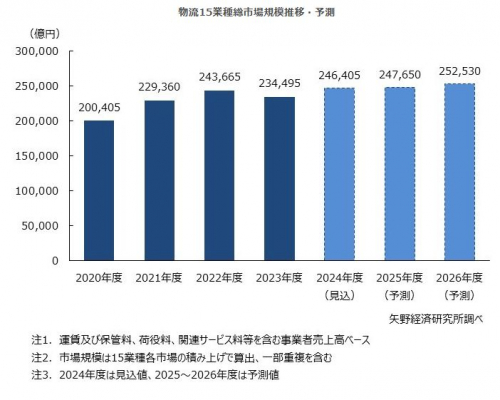 【矢野経済研究所プレスリリース】物流15業種市場に関する調査を実施(2025年)〜2024年度の物流15業種総市場規模は前年度比5.1%増の24.6兆円の見込、市場は再び増加基調に転じる見通し〜