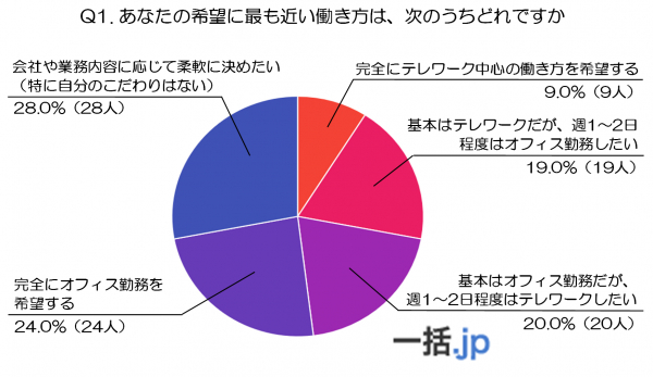 一方、「基本はテレワークだが、週1〜2日はオフィス勤務したい」は19.0%(19人)、「完全にテレワーク中心の働き方を希望する」は9.0%(9人)にとどまりました。テレワークを中心とした働き方を選ぶ人は一定数いるものの、出社とのバランスを取りたいという意識の方が強いようです。
