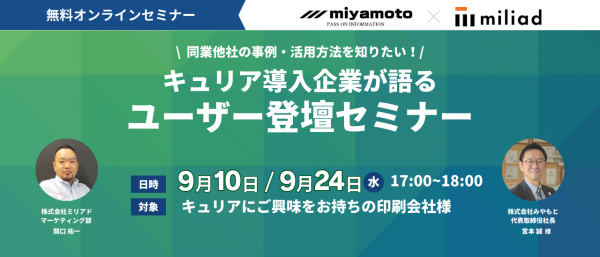スマホコンテンツ制作ツール「キュリア」を運営する株式会社ミリアド(本社:東京都渋谷区、代表取締役CEO:樋口 清政)は、2025年9月10日(水)/9月24日(水) 17時から、印刷業界向けに 【ユーザー企業の生の声をお届け】キュリア導入企業 登壇セミナー と題して、株式会社みやもと(本社:栃木県宇都宮市)にご登壇いただく無料オンラインセミナーを開催することをお知らせいたします。