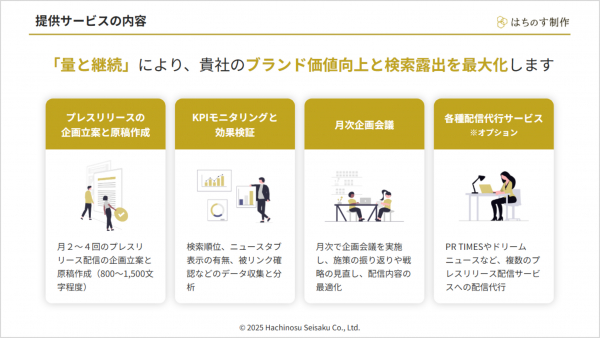 SEO記事作成やオウンドメディア運営全般のサービスを中心としたWebコンテンツ制作サービスを提供している株式会社はちのす制作(本社:東京都、以下「はちのす制作」)は、プレスリリース配信によるWeb上の信用を高めることでLLMO対策とE-E-A-Tを強化しSEO対策にもつながる「プレスリリース運用支援サービス( https://hachinosu-seisaku.co.jp/press-release/ )」を2025年8月8日に公開いたしました。