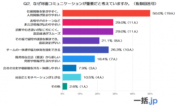 最も多かったのは「信頼関係を築きやすく、人間関係が深まりやすい」で、50.0%(19人)でした。対面コミュニケーションが単なる業務のやり取りではなく、信頼構築の基盤として重視されていることがうかがえます。