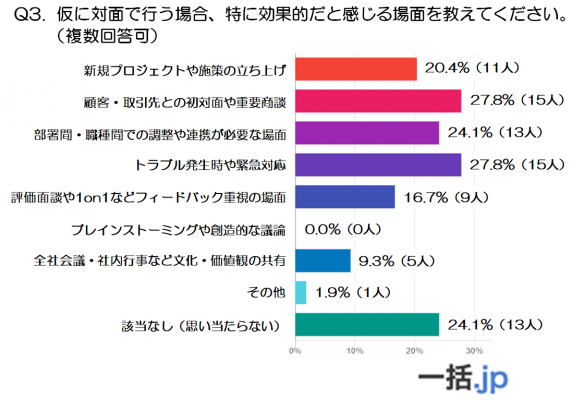 次いで「部署間・職種間での調整や連携が必要な場面」24.1%(13人)と、「該当なし(思い当たらない)」24.1%(13人)が同数となりました。社内の複雑な調整の場面で対面の有効性が認識されている一方で、特に対面で効果的と感じる場面がないとする回答も同程度見られ、対面の必要性に対する認識の差が見受けられます。