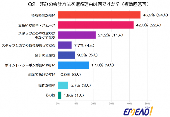 最も多かったのは「待ち時間が短い」で46.2%(24人)を占めました。買い物における効率性が強く重視されており、会計の選択基準に直結していることがうかがえます。