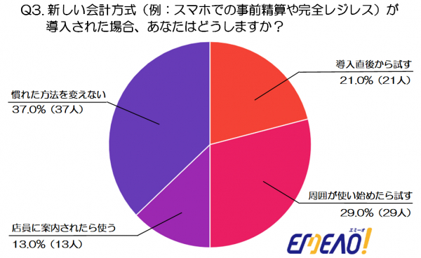 調査結果3:新しい会計方式(例:スマホでの事前精算や完全レジレス)が導入された場合、あなたはどうしますか?