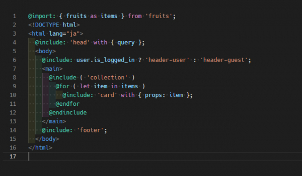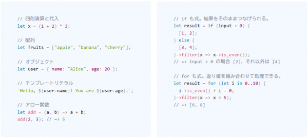 ほとんどの構文が値を返す式ベースの言語で、条件分岐も繰り返しも関数定義も、すべてが式として扱われるのが特徴。複雑なロジックもシンプルに記述できる設計で、描画を目的とするテンプレートエンジンとの高い親和性を実現しました。