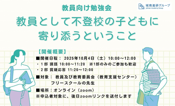 株式会社城南進学研究社(本社:神奈川県川崎市、代表取締役社長CEO:千島克哉、以下「当社」)は、2025年10月4日(土)、不登校の児童生徒を持つ教員を対象とした勉強会「教員として不登校の子供へ寄り添うということ」を開催します。