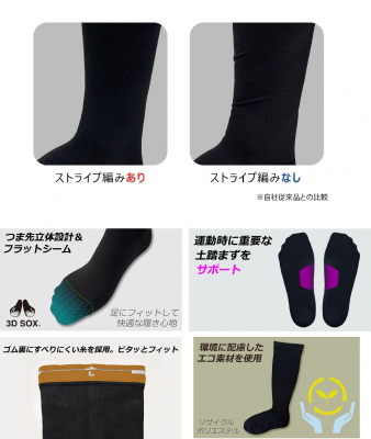 他にも、足指の形状に沿った立体設計(3DSOX)と独自の凹凸感の少ないフラットシームリンキングや運動時に重要な土踏まずをサポートする編み構造を採用し、履き口(ゴム部)肌側にはグリップ性の高い高摩擦糸を使用し、ねじった後もずり落ちにくくピッタリとフィットさせ、より快適な履き心地に仕上げました。また、ボディ(本体部)には吸水速乾性に優れたリサイクルポリエステル糸を採用。環境に配慮したエコ素材を使用しています。