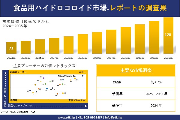 SDKI Analytics(本社:東京都渋谷区)は、このたび、2025年09月23に「食品用ハイドロコロイド市場調査レポート:2025−2035年の市場規模、シェア、傾向の予測」を発表しました。食品用ハイドロコロイドに関する市場調査レポートには、統計的および分析的アプローチを使用した予測評価が含まれています。この調査レポートでは、一次および二次調査方法を使用して分析された主要な業界洞察を通じて将来の傾向を理解できるようにすることで、主要な市場動向を読者に説明しています。
