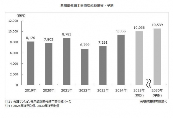 また、共用部修繕工事市場については、2025年は前年比7.3%増の1兆38億円、2030年には2024年比12.7%増の1兆539億円になると予測する。経年劣化に伴う小規模な修繕工事の増加や築年数が経過したマンションストック数の増加、長寿命化に対応した修繕工事ニーズの増加により、共用部修繕工事市場も堅調な拡大を見込む。