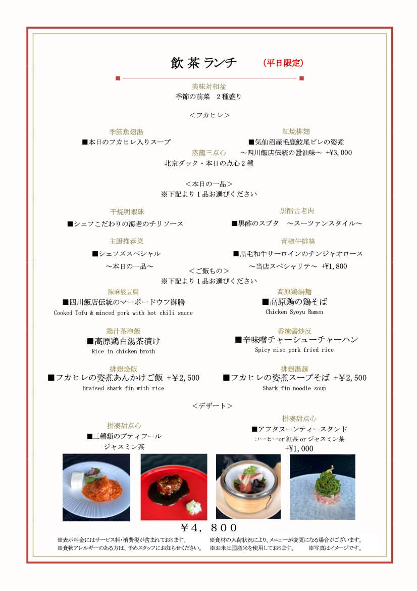 フカヒレスープや、香ばしく焼き上げた北京ダック、手作りの点心などを盛り込んだ、平日限定の飲茶ランチ。