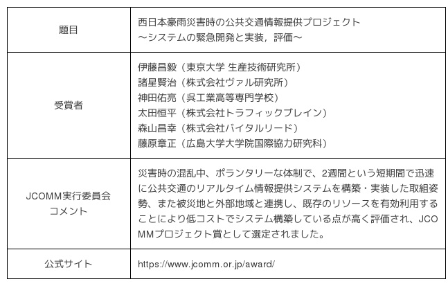 このたび令和元年度のJCOMM賞において、都市・地域のモビリティの質的改善や渋滞、環境問題などの諸問題の緩和に大きく貢献し、その完成度・応用可能性や取り組み姿勢がすぐれたプロジェクトに授与される「JCOMMプロジェクト賞」を、ヴァル研究所を含めた西日本豪雨災害時の公共交通情報提供プロジェクト参加者が受賞いたしました。