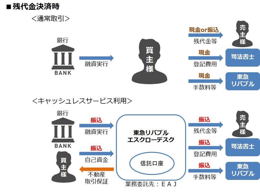 東急リバブル株式会社(本社:東京都渋谷区、代表取締役社長:太田 陽一、以下「東急リバブル」という。)は、株式会社エスクロー・エージェント・ジャパン(本社:東京都千代田区、代表取締役社長:本間 英明、以下「EAJ」という。)が提供する決済代行サービスを活用し、東急リバブルが仲介する個人間の不動産売買契約における契約締結時と残代金決済時の売買代金等の授受並びに諸費用等の各種支払いを、信託口座を利用して全て振り込みにて行うキャッシュレスサービスの提供を開始しましたのでお知らせいたします。