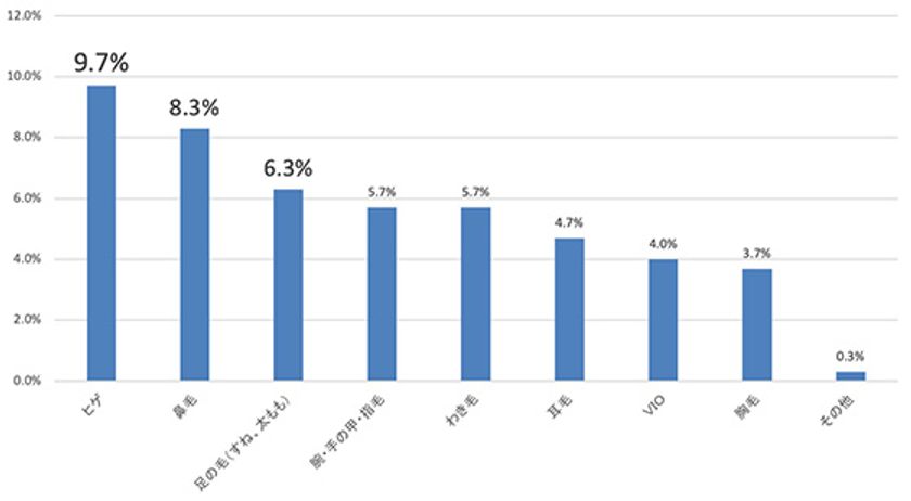 次に、脱毛している部位を尋ねたところ、一位は「ヒゲ」9.7%、二位「鼻毛」8.3%、三位「足の毛(すね、太もも)」6.3%という結果に。普段人目につく箇所が人気になりました。【図3】