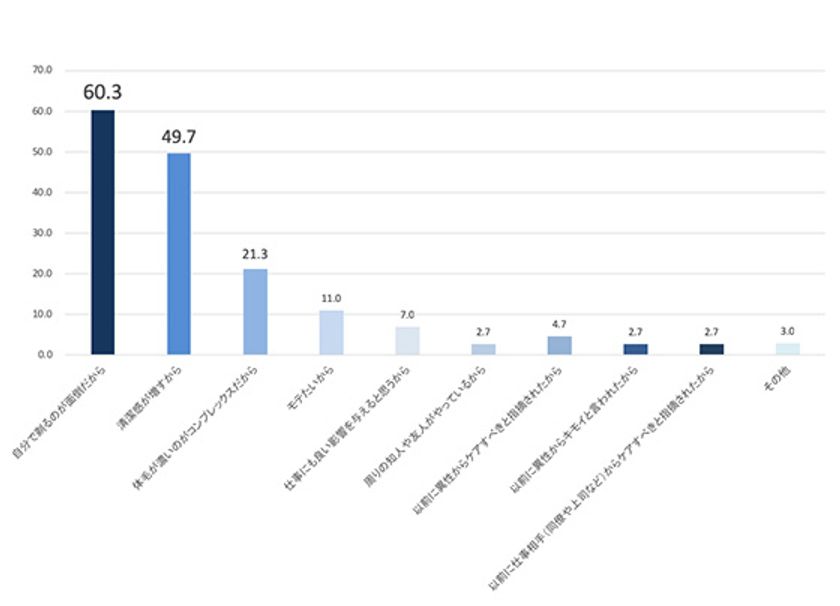 脱毛をしてみたい、している理由を尋ねたところ、約6割もが「自分で剃るのが面倒だから(60.3%)」と回答。