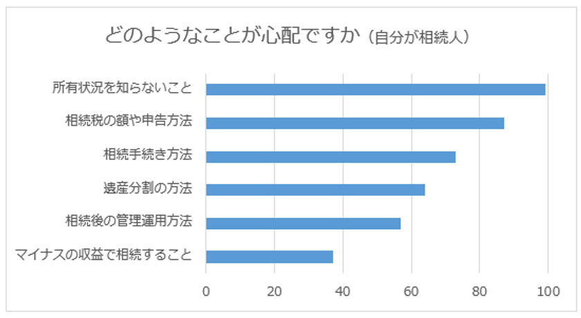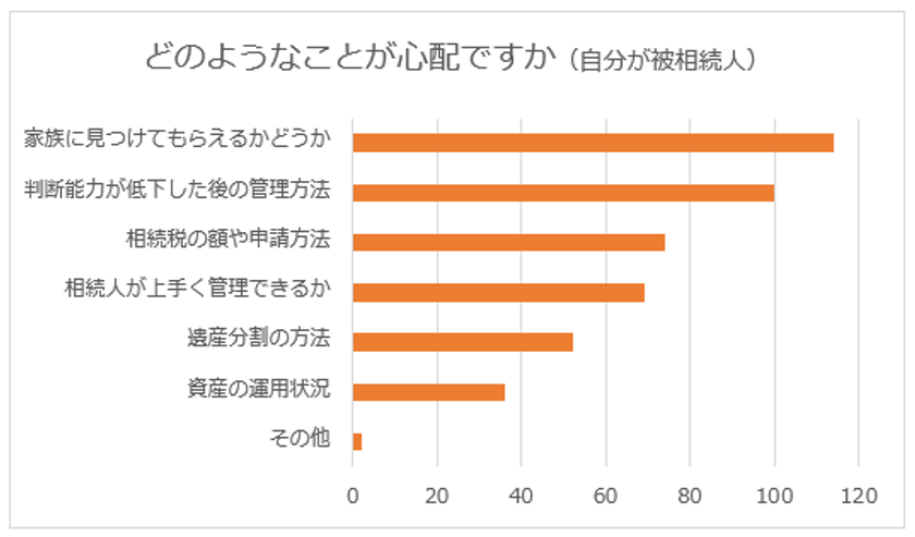 親や配偶者が他界することによって自分が相続人になった場合、デジタル資産の相続でどのようなことが心配になると考えられるかの問いには、「所有状況を知らないこと」がトップの回答になりました。