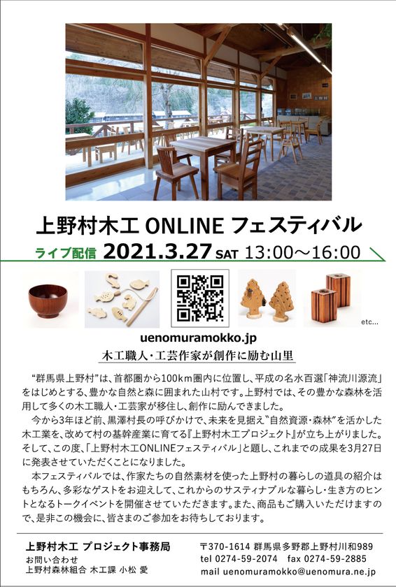 上野村木工 プロジェクト事務局はこの度、3月27日13時より、「上野村木工ONLINEフェスティバル」と題し、ホームページ上で木工品のオンライン展示販売会・トークショーを開催することとなりましたのでご案内申し上げます。