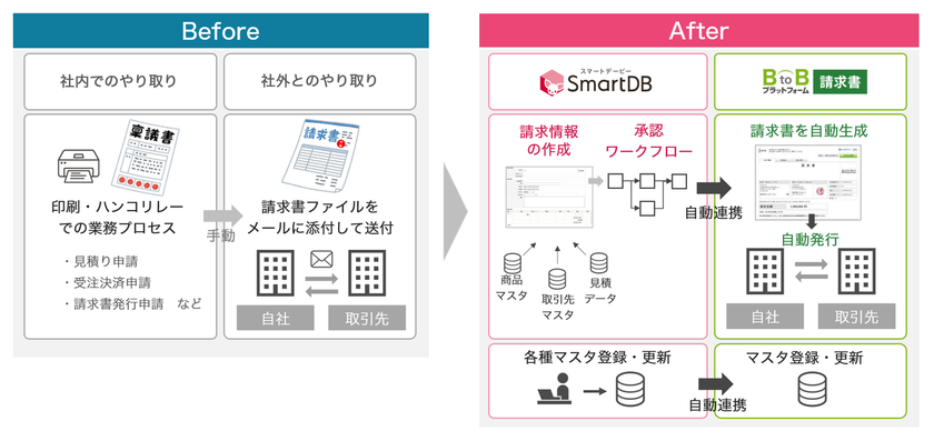 今回、「BtoBプラットフォーム 請求書」と「SmartDB」が連携することで、請求書発行における承認ワークフローから取引先への請求書発行までの業務プロセス全体のデジタル化を一気通貫で実現できます。