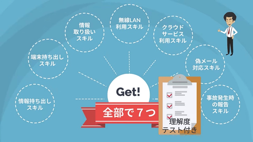 【内容】アニメ形式で日常に潜む脅威と対策を学びます。組織の情報をまもるために身に着けておきたいセキュリティ対策を5つのテーマから学習し、最後に理解度チェック(10問)で理解度を確認します。1テーマ10分程度。テーマ毎に少しずつ取り組むこともできます。