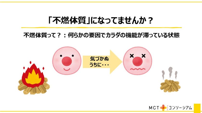 本来、私たちのカラダはエネルギー源を摂取し、そのエネルギーは活動を通じて消費しています。しかし、自粛生活が長引くことで、通勤や運動機会など活動量が格段に減りました。それに伴い、体型の変化で悩む人が増えています。そうした、活動不足など何らかの原因でカラダの機能が滞っている状態が続くと、気がつかないうちに、脂肪が蓄積されやすい“不燃体質”になってしまいます。