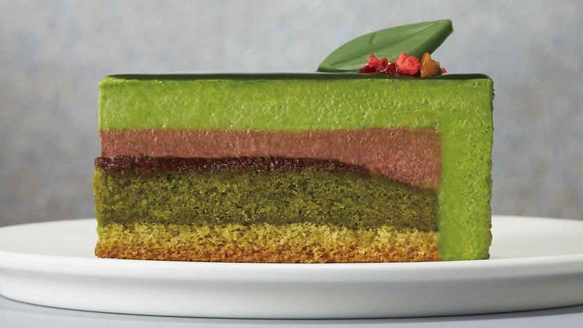 宇治抹茶スポンジを土台に、宇治抹茶ガトーショコラ、乾燥クレープを砕いて宇治抹茶を和えたフィアンティーヌ、ラズベリーショコラクリームを重ね、宇治抹茶ショコラムースで覆った後、宇治抹茶グラサージュで全体をコーティング。葉っぱ型の宇治抹茶チョコレートとフリーズドライストロベリー、アーモンドダイス、伊藤久右衛門のロゴ入りチョコプレートで和を感じるクリスマスケーキに仕上げました。何層にも重なる宇治抹茶の味わいと甘酸っぱいラズベリーの調和を余すところなくお楽しみいただけます。