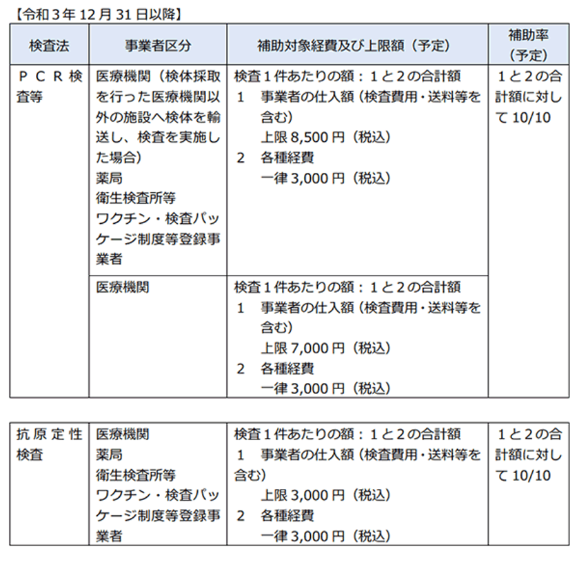 また、東京都とその他の道府県は健康上の理由でワクチン接種を受けられない方や12歳未満の子供が「ワクチン・検査パッケージ」等を利用する際などに無料でPCR等検査を受けられるようにするため、検査を実施する事業者を募集しています。また、無料検査を実施する事業者が行う検体採取等に必要な検査等費用(上限11,500円)と検査体制整備の初期投資費用(上限1,300,000円)が補助されます。
