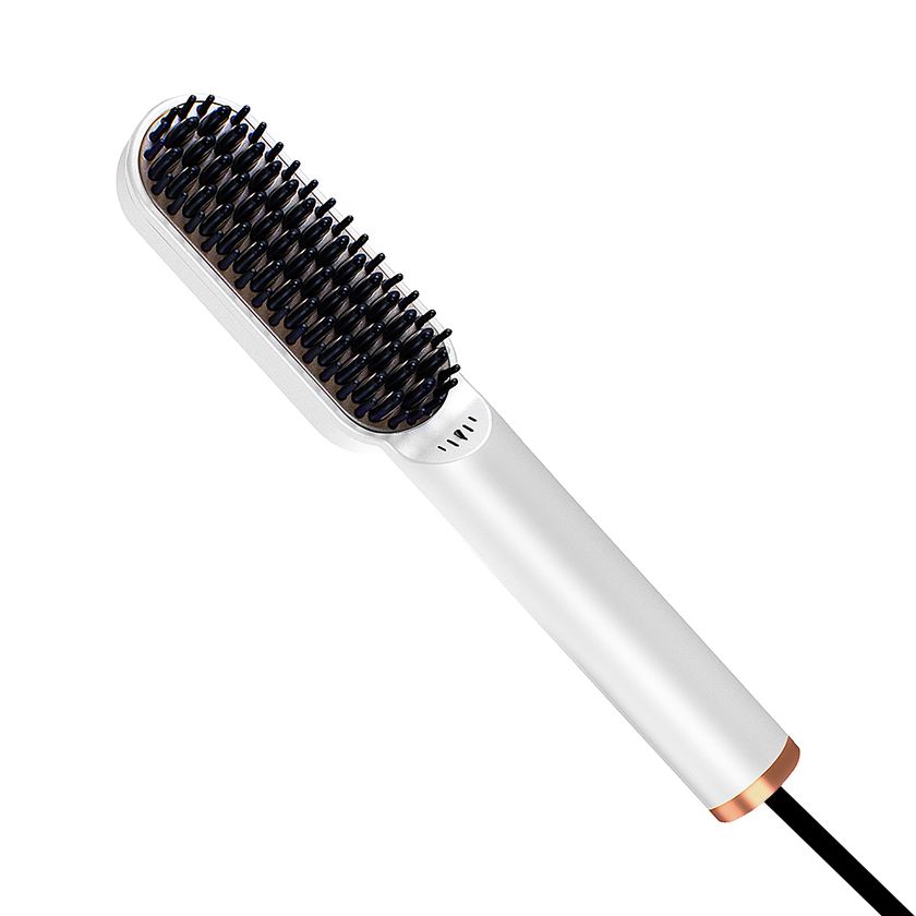 イオン発生機能付きヒートブラシは120℃から200℃までの5段階に温度設定ができ、ご自身の髪質に最適な温度を設定できます。ブラシ部分は柔らかいゴム素材でコーティングしており、本体の電源ケーブルは360°回転するのでコードが絡まりにくい設計となっております。従来製品に、イオン発生機能を追加することで、髪を痛めにくく、長い髪のスタイリングはもちろん、男性でも寝ぐせや髭のお手入れにも最適なブラシです。カラーはブラックとホワイトの2色で、高級感のあるゴールドのフレームをあしらったデザインとなっております。