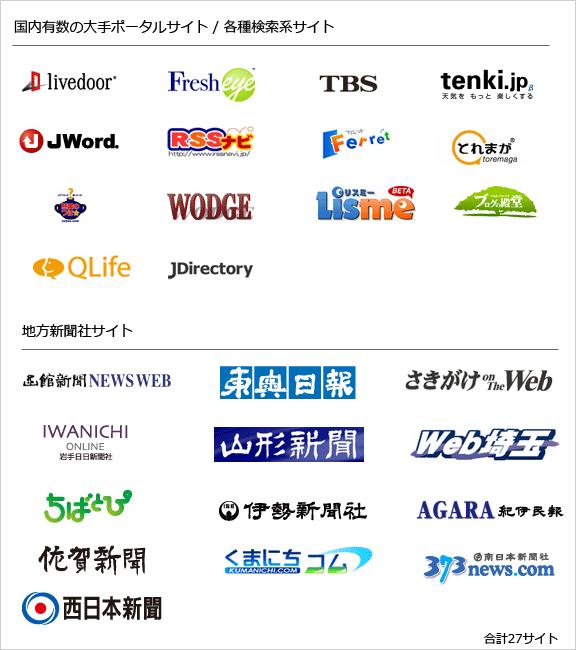 国内で有数のポータルサイトであるlivedoorを筆頭に、Fresheyeなどの大手ポータルサイト、西日本新聞、山形新聞などの有力地方新聞社サイトなどバラエティ豊かなラインナップとなっております。