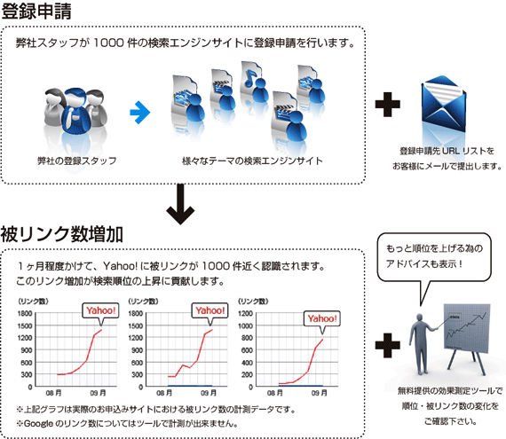 登録先サイトの300件~1000件という件数の多さに加え、IPアドレス分散、ドメイン分散といったSEOに有効な要素を数多く含んでいるため、目に見えて順位が上がるケースが多いのが特長です。